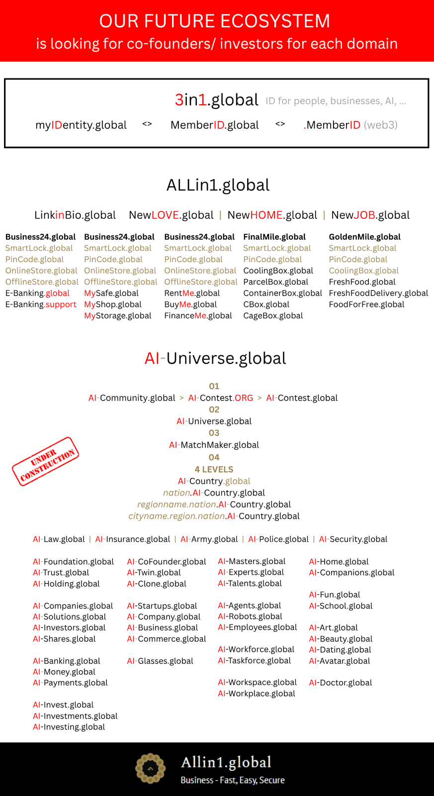 - The financing of well-being and prosperity is to be achieved primarily through AI agents (brain) and AI robots (brain & body), so that we humans (brain, body & soul) always have a choice and can devote ourselves to the beautiful aspects of life and work.